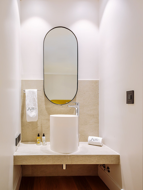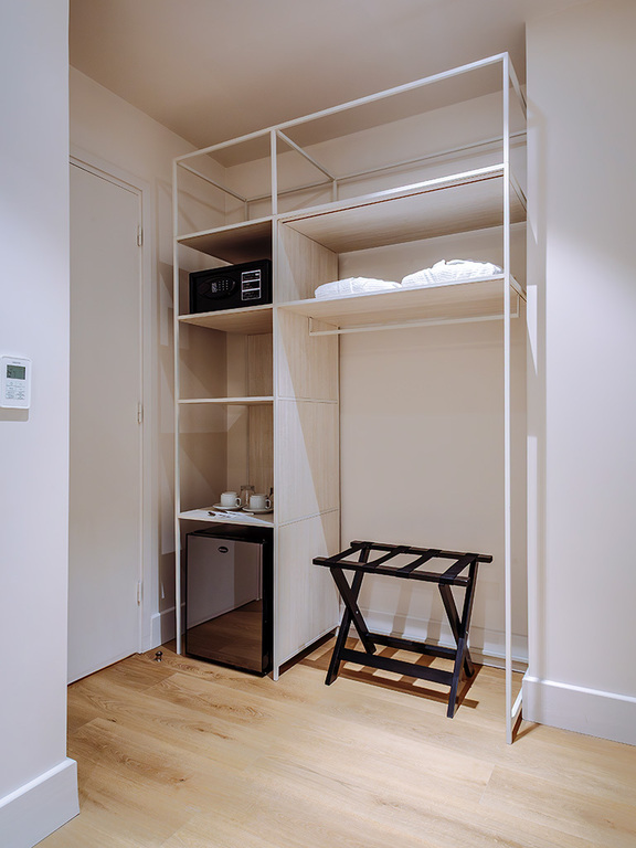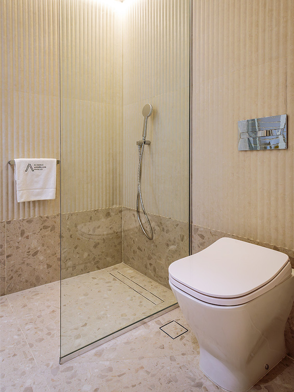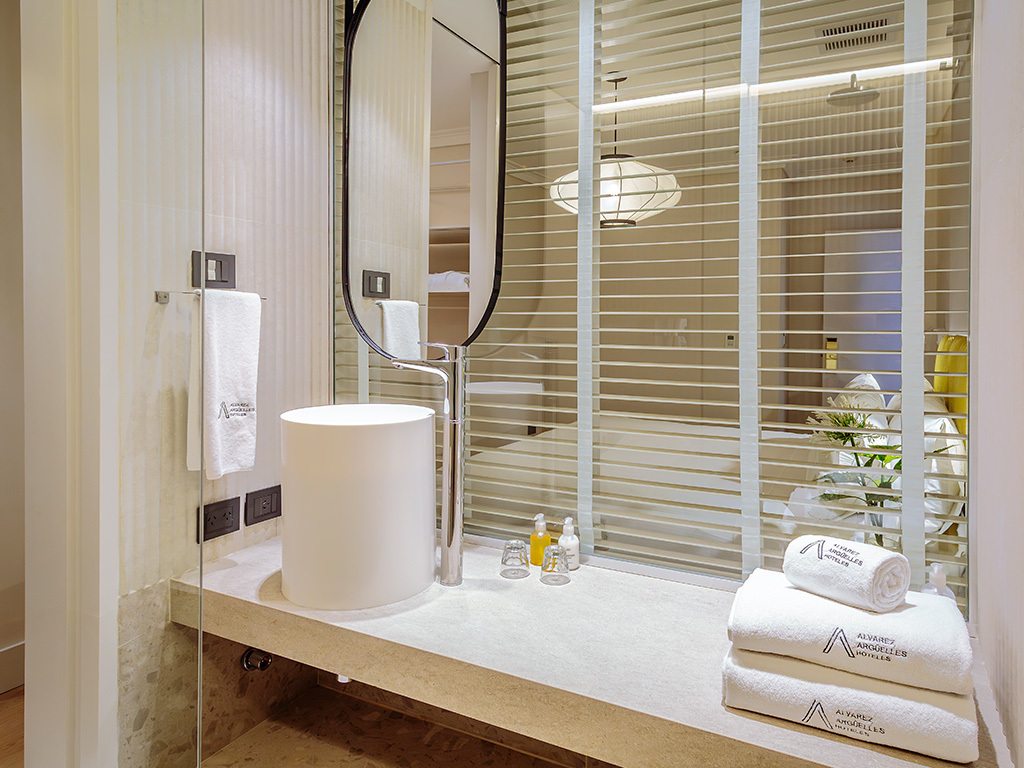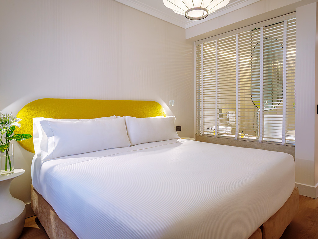 Habitación con 1 cama king de 1,80 x 1,90, TV Smart 50", pava electrica, caja de seguridad, frigobar, box ducha, secador de pelo, batas y aire acondicionado. Vista interna.